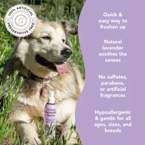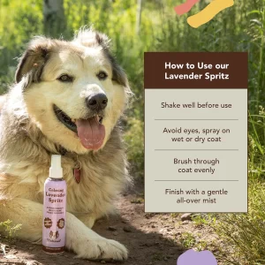• Introducing Calming Lavender Spritz, the perfect companion to our Calming Lavender Shampoo for an easy way to clean dogs between baths. Crafted with care, it harnesses the soothing power of lavender essential oil, gently calming your pet's skin. Enriched with natural ingredients like nourishing Aloe Vera, it moisturizes and conditions fur, leaving it soft and shiny. Say goodbye to odors…